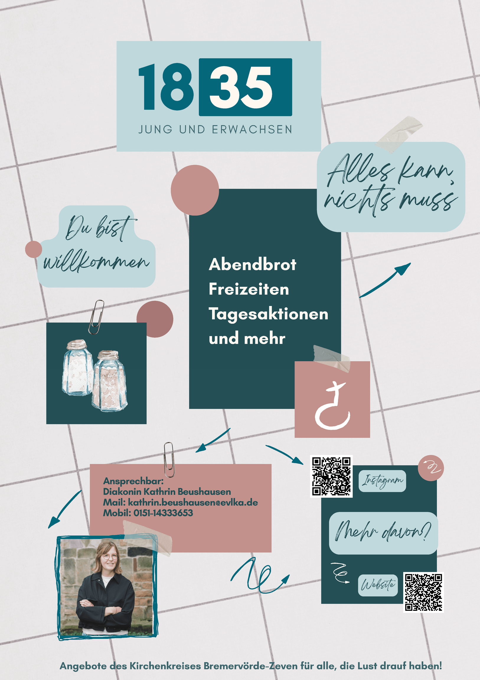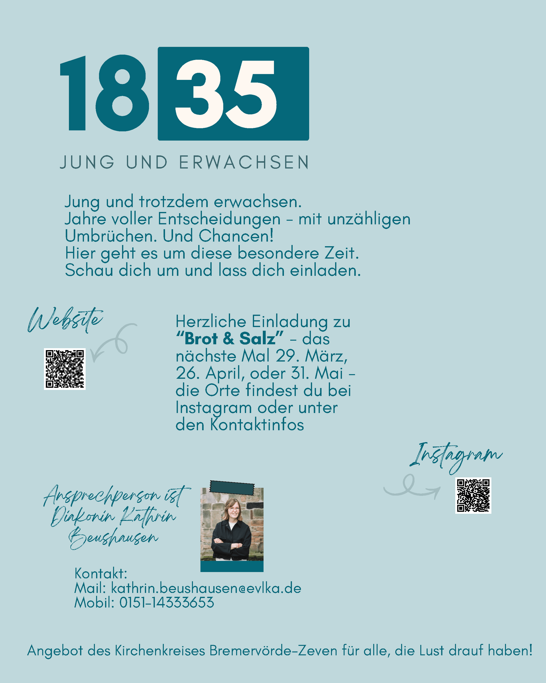 Seit Kurzem ist Kathrin Beushausen mit ihrem Angebot „1835 – Jung & erwachsen“ am Start. Die neue Reihe richtet sich an Menschen zwischen 18 und 35 Jahren – an alle, die sich in einer Lebensphase voller Aufbrüche, Übergänge und Fragen bewegen. Zwischen Studium, Ausbildung, Jobstart, Beziehungen und Neuanfängen entsteht hier ein Raum zum Ankommen, Austauschen und Durchatmen. Was genau hinter „1835 – Jung & erwachsen“ steckt, welche Idee das Angebot trägt und wie junge Erwachsene mitmachen oder eigene Impulse einbringen können, erzählt Kathrin im folgenden Interview.